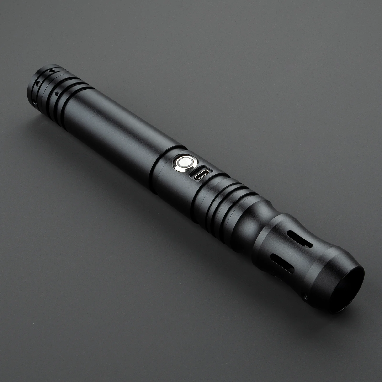 Beschrijving: Dark Eminent is een mat zwarte saber gemaakt van aluminium legering. Dit zorgt ervoor dat het handvat licht van gewicht is en toch erg sterk is. De saber heeft een versmalde emitter welke prettig vasthoudt maar ook is voorzien van langwerpige uitsneden voor een extra lichteffect. Door de saber op deze plek vast te houden heb je een perfect balans. De zwaardligging is goed diep in het handvat waardoor deze super stevig vast zit. Bij elkaar maken deze zaken de Dark Eminent uitermate geschikt om mee te duelleren of te spinnen. Het handvat zelf is geheel zwart en glad wat zowel prettig vasthoudt als de saber een strakke uitstraling geeft. Aan de onderzijde van de saber bevind zich een connector ring op de plaats van de pommel. Met een tweede saber zoals bijvoorbeeld de Acolyte hoef je dus niet een extra connector ring te kopen om een saberstaff te maken. De vlakke onderzijde zorgt er tevens voor dat de saber perfect stevig recht op gezet kan worden om te worden tentoongesteld in huis.