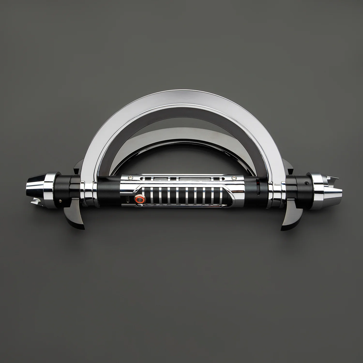 Beschrijving: De Dark Twist is met recht een legendarische saber welke door zijn unieke en iconische uitstraling meteen wordt herkent. Het handvat is iets groter dan een gemiddelde saber maar veel korter dan bijvoorbeeld de Saberstaff. Deze Dark Twist dualsaber wordt tevens bedient vanaf één knop en het is mogelijk de saber op verschillende manier te gebruiken. Bijvoorbeeld met de ring dichtgevouwen of opengevouwen en met één of twee blades. De binnenzijde van de ring is zwart en de buitenzijde glimmend zilver.