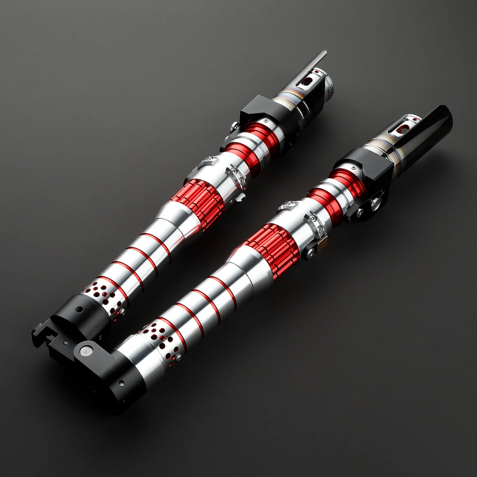 Beschrijving: Het design van de Delphic is geïnspireerd door het idee dat de heldin van de sequels naar haar grootvader had geluisterd en het pad van de dark side bewandeld. Het model Delphic is een grootte dual saber welke bestaat uit twee sabers aan elkaar gekoppeld doormiddel van openklap systeem. Hierdoor is het mogelijk om de saber opgevouwen open te laten vallen en direct een dualsaber te hebben. Wanneer de saber niet is opengeklapt wordt deze bij elkaar gehouden doormiddel van magneten aan de sabers. Tevens is het koppelstuk los te draaien waardoor je de twee sabers ook los van elkaar kan gebruiken. De saber is in de basis zilverkleurig met rode accenten. Het zwaartepunt ligt door de verbreding en lange formaat van deze saber ver naar voren. Hierdoor is de Delphic uitermate geschikt om mee te spinnen als dualsaber. De verbreding in de sabers is versiert met rood kleurige buisvormige beplating wat wel iets wegheeft van het magazijn van een revolver.