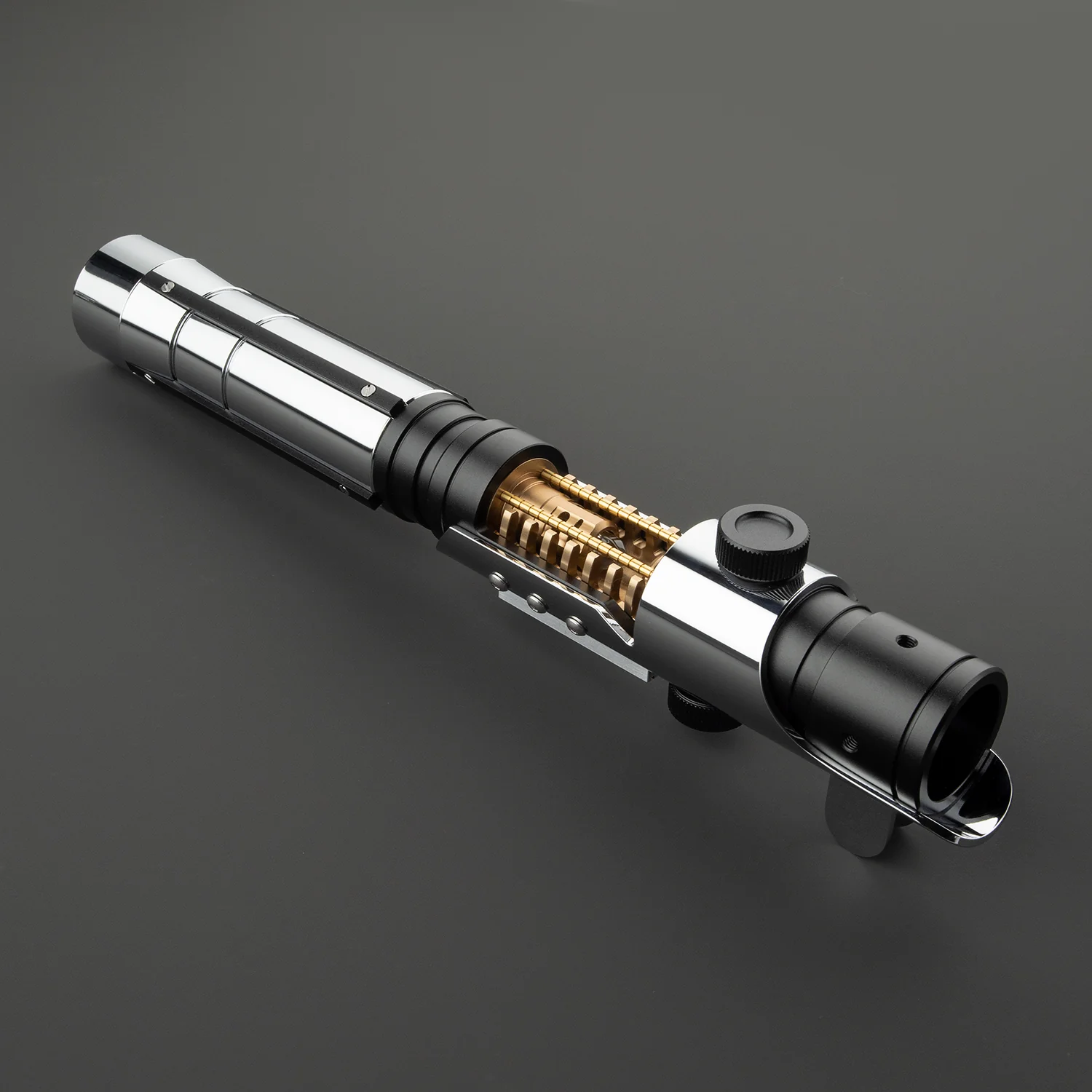 Het handvat van de Dreadnought is gemaakt van een stevige zwarte core met hoogglans zilveren beplating. De beplating is belegd met diverse details en is straks afgewerkt. Bij elkaar geeft dit een realistische en hoogwaardige uitstraling. De lightsaber ligt soepel in de hand is ideaal voor cosplay en duelleren. Maar ook perfect om als trofee ten toon te stellen in huis! Het hoogtepunt is natuurlijk de opengewerkte kyber kamer. De kyber kleurt mee met de kleur van het zwaard. De oplaadpoort is weggewerkt aan de onderkant (binnekant) van de saber om deze een nog realistischer uiterlijk te geven. De bedieningsknop zelf is geintergreerd in de opstaande beplating aan de achterzijde van de kyber.